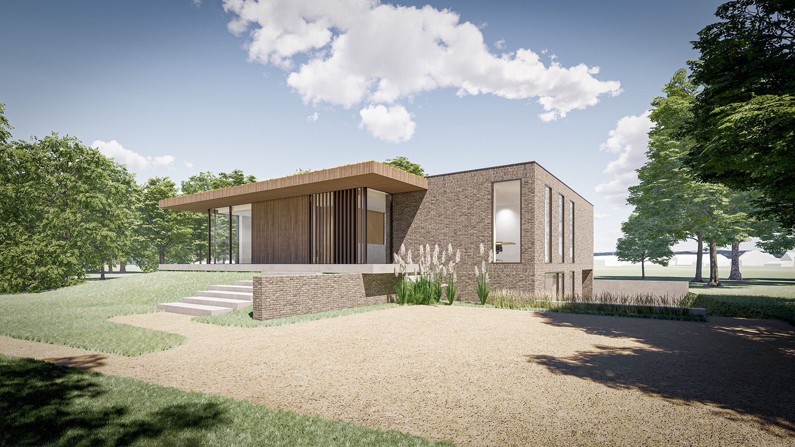 In een oude boomgaard is de ruimte gegeven om drie vijstaande woningen op een natuurlijke wijze in het landschap in te passen. Deze moderne vrijstaande villa is één van de drie woningen.