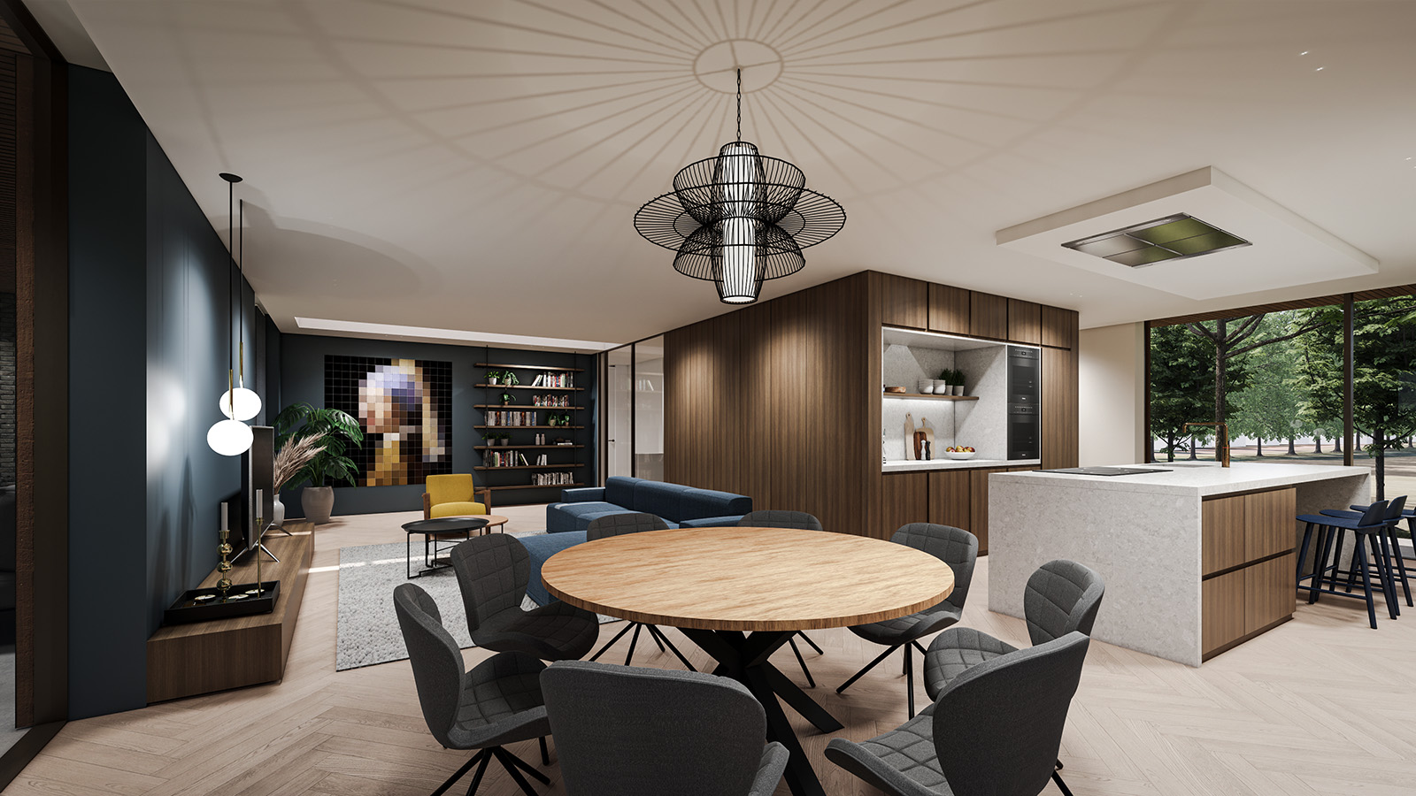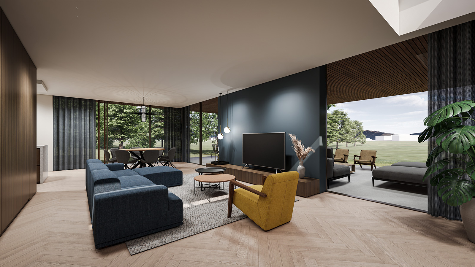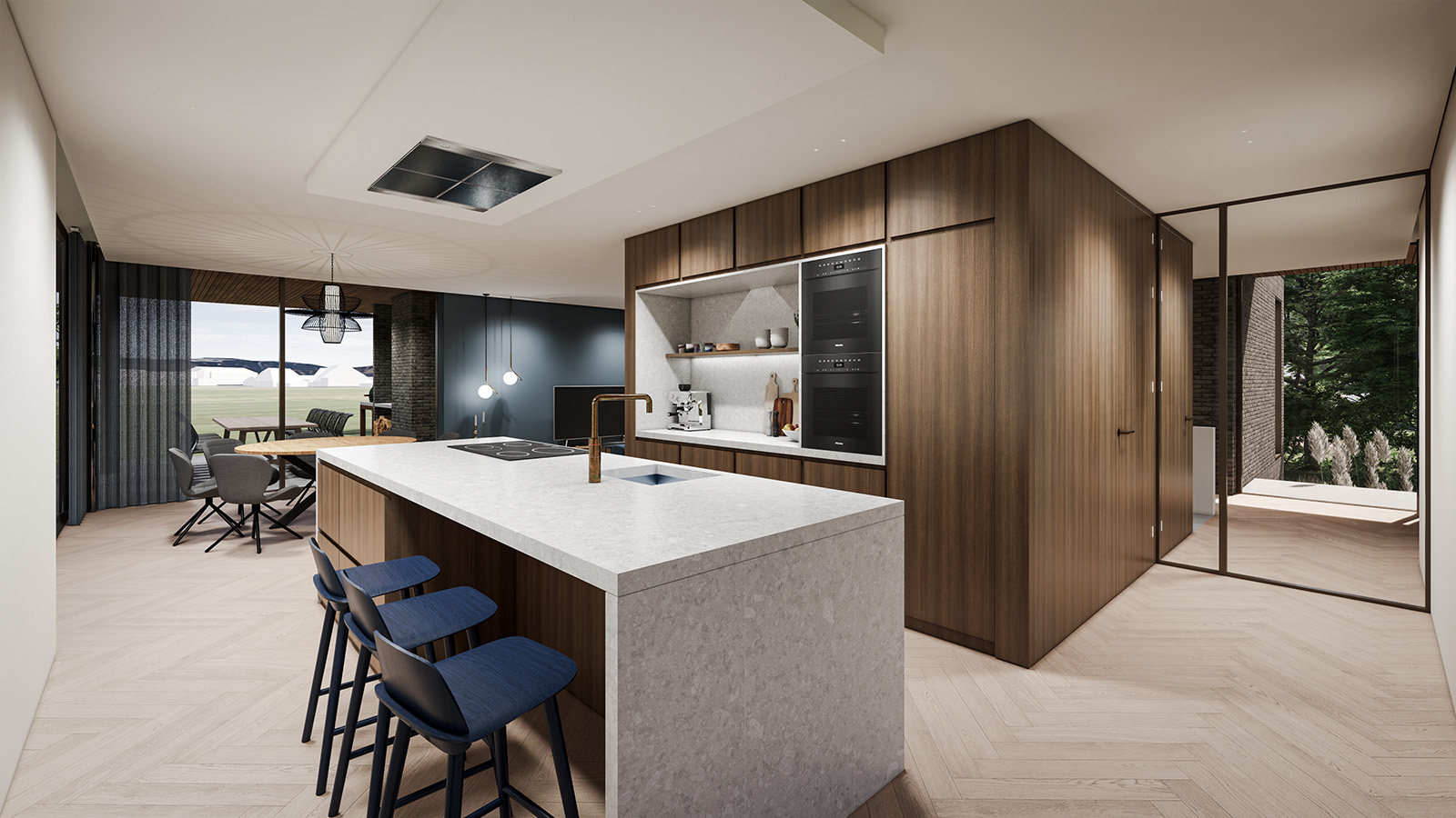 Het linker deel van de woning is juist heel transparant uitgevoerd en opgebouwd uit houtskeletbouw. Hier vind je naast de entree de keuken en ruime woonkamer. Vanuit elke positie is weids uitzicht op de groene omgeving door verdiepingshoge glazen puien.