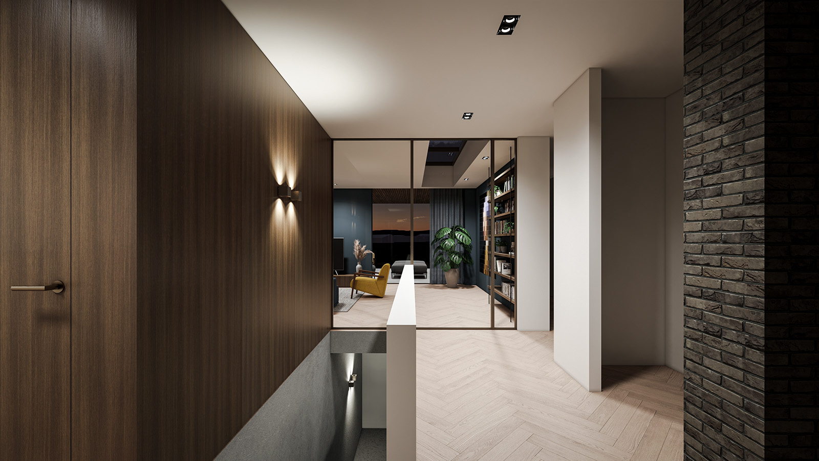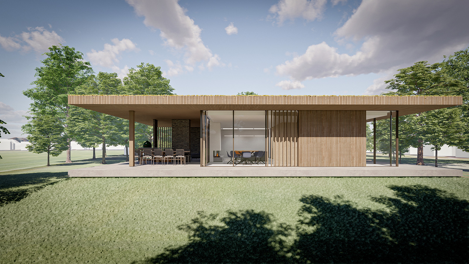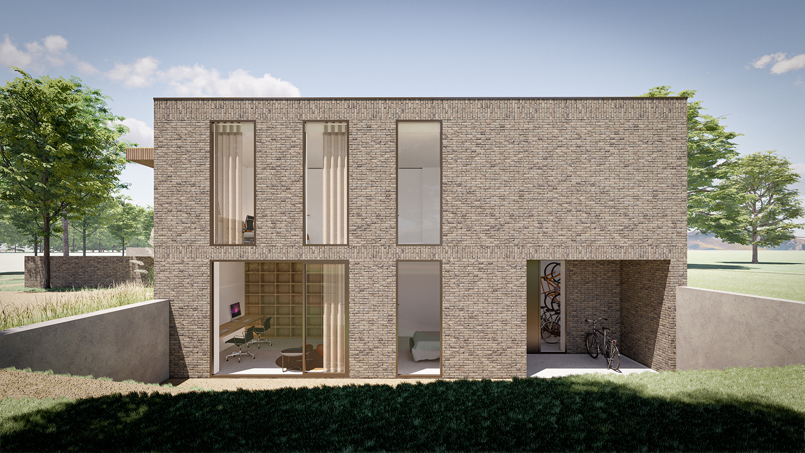 Het linker deel van de woning is juist heel transparant uitgevoerd en opgebouwd uit houtskeletbouw. Hier vind je naast de entree de keuken en ruime woonkamer. Vanuit elke positie is weids uitzicht op de groene omgeving door verdiepingshoge glazen puien.